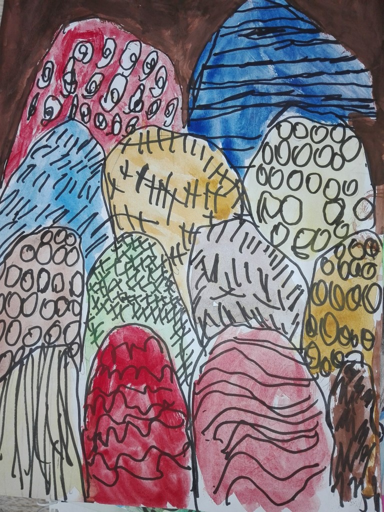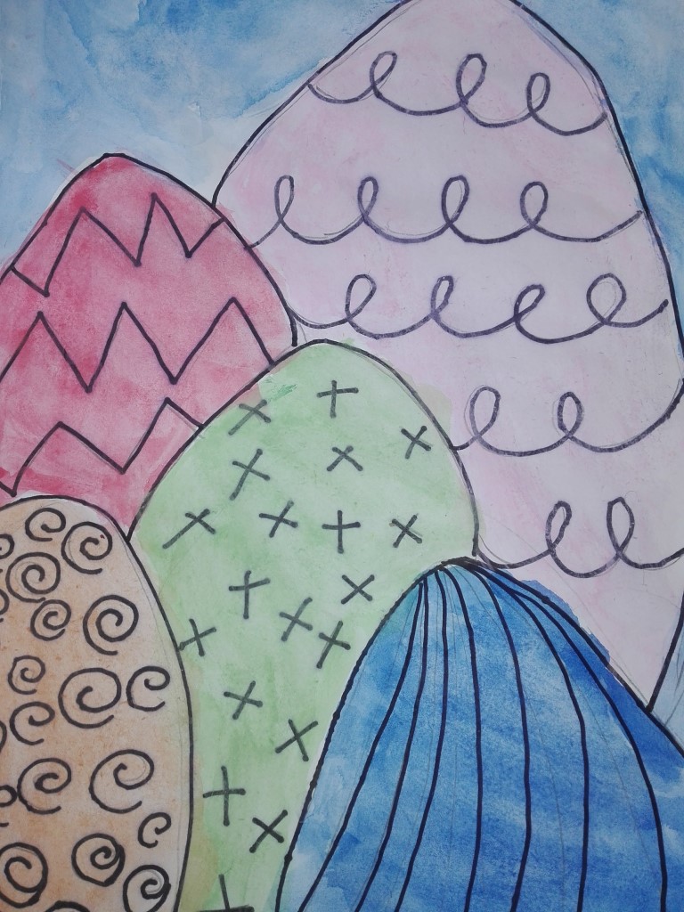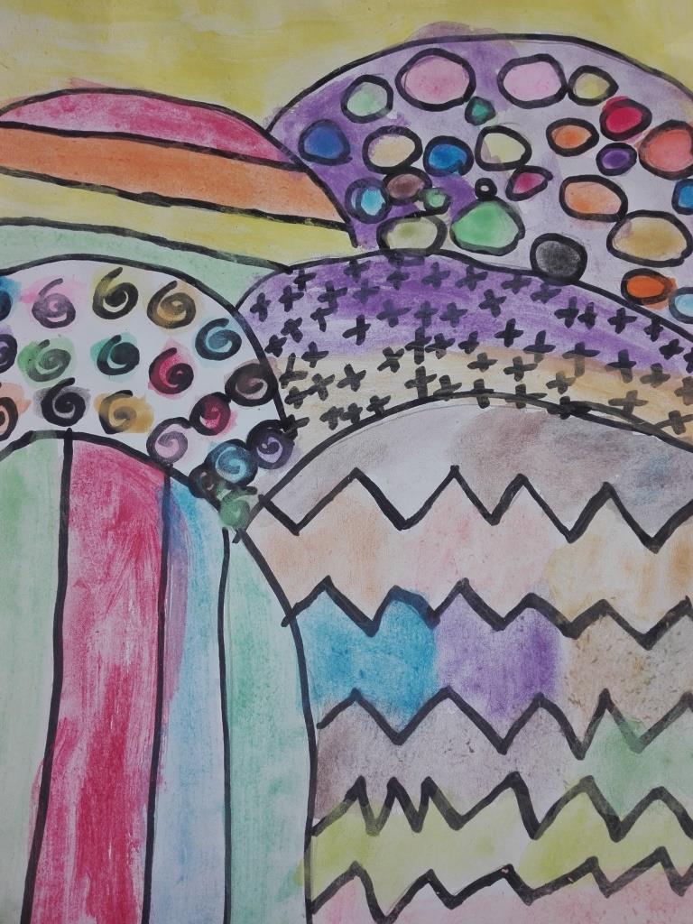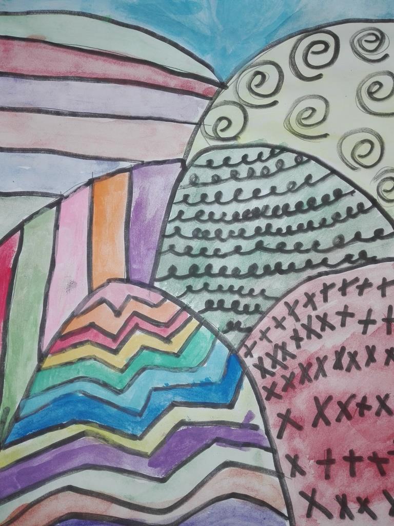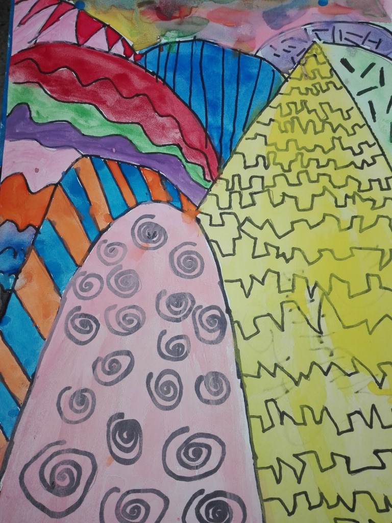 Cuarto grado trabajó la noción de textura visual Diseñamos un paisaje montañoso, donde las texturas visuales cubren las superficies de las distintas figuras de la composición, dando así lugar a una transposición de la representación de lo táctil a lo visual.