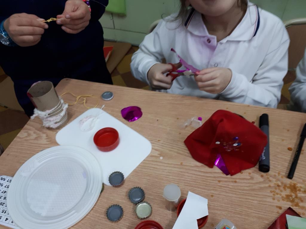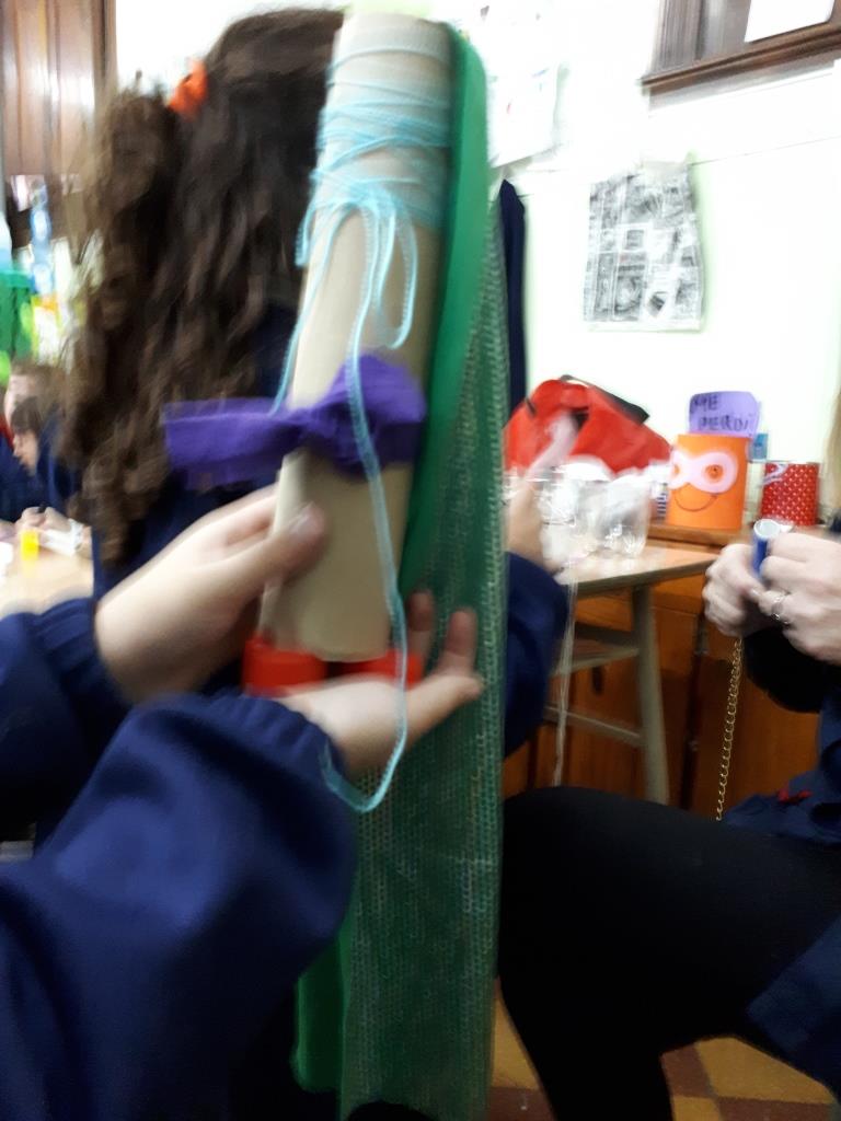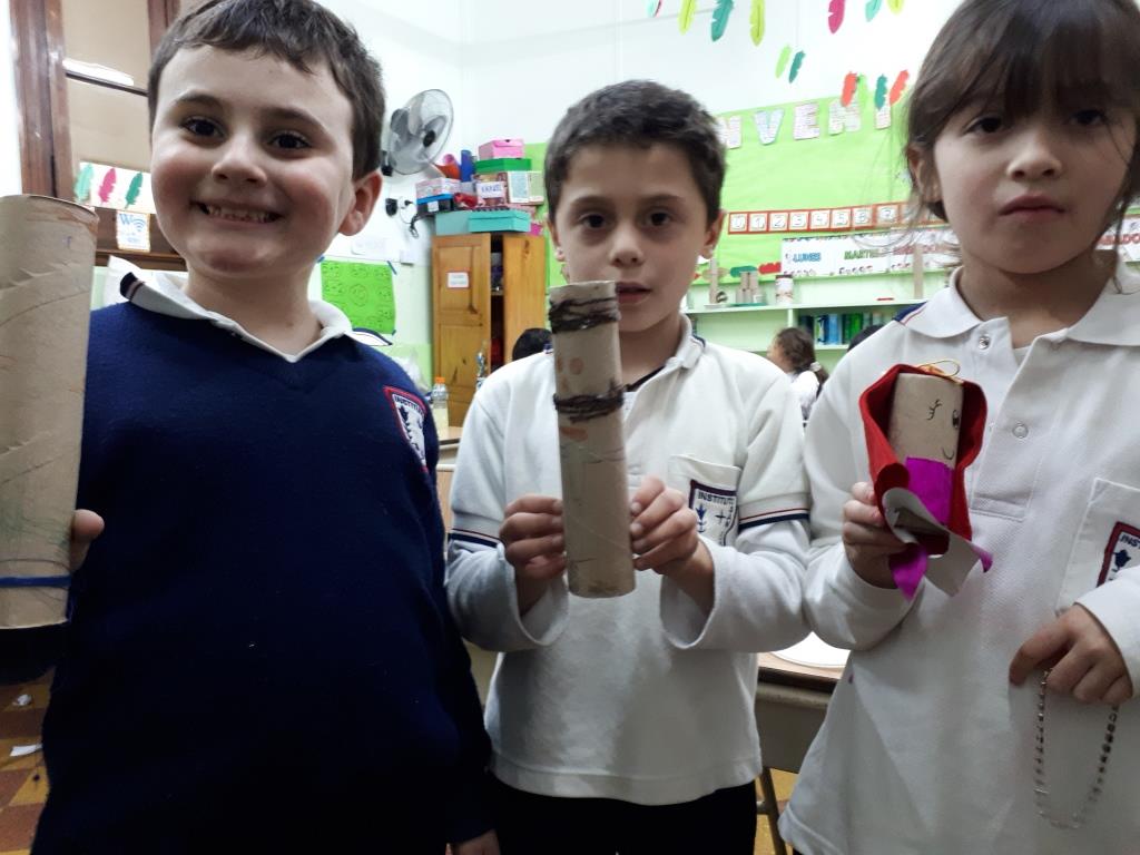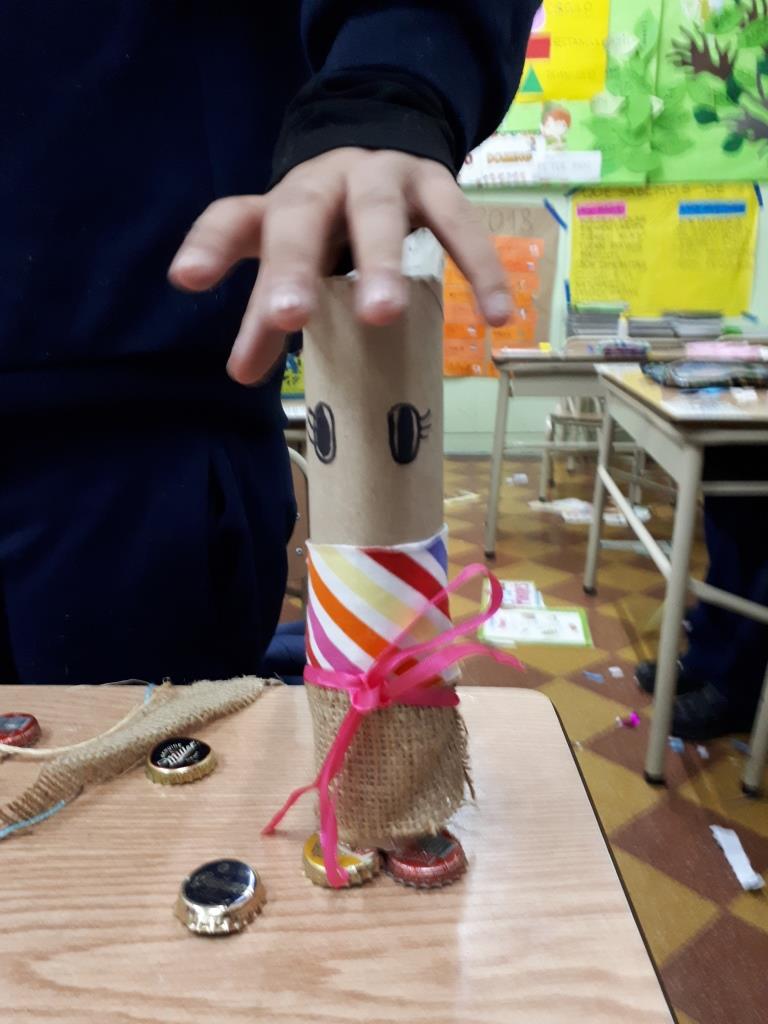 Talleres Personajes realizados en tubos de cartón dibujados con colores adornados con lana de colores.